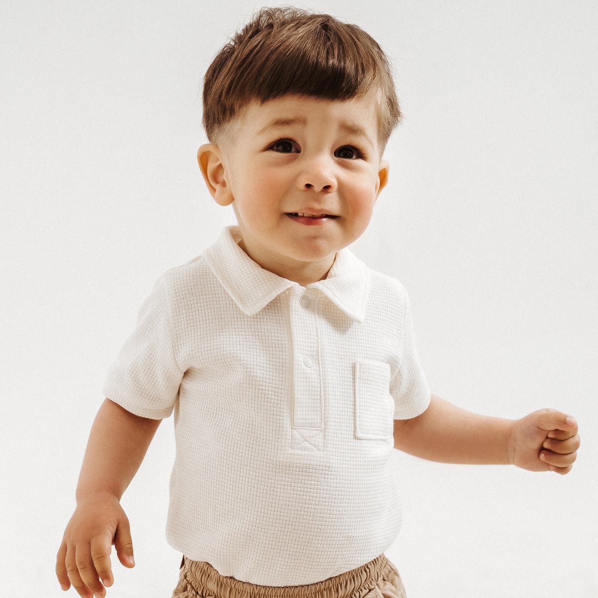 Боди выполнено в светлом цвете из мягкой ткани — вафельный трикотаж. Боди с короткими рукавами и классическим воротником в стиле поло. На груди есть небольшой накладной карман.