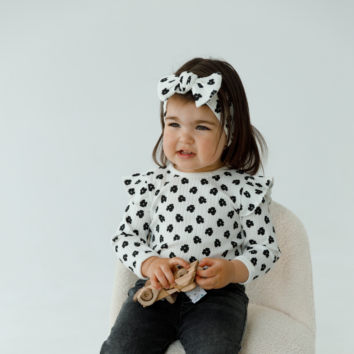 Боди для девочек – идеальный выбор для маленьких принцесс. Боди для малыша выполнено с длинным рукавом и для нарядности декорировано милым воланом на рукавах. В наш комплект в тон к бодику идет детская повязка на голову.