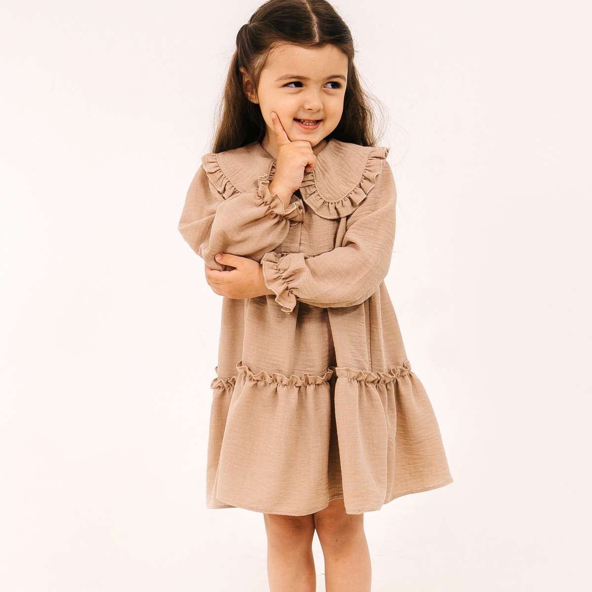 Платье нежного пудрово-бежевого цвета. Свободный, немного расклешенный крой. Спереди  пуговицы на груди. Крупный округлый воротник с рюшами по краю.