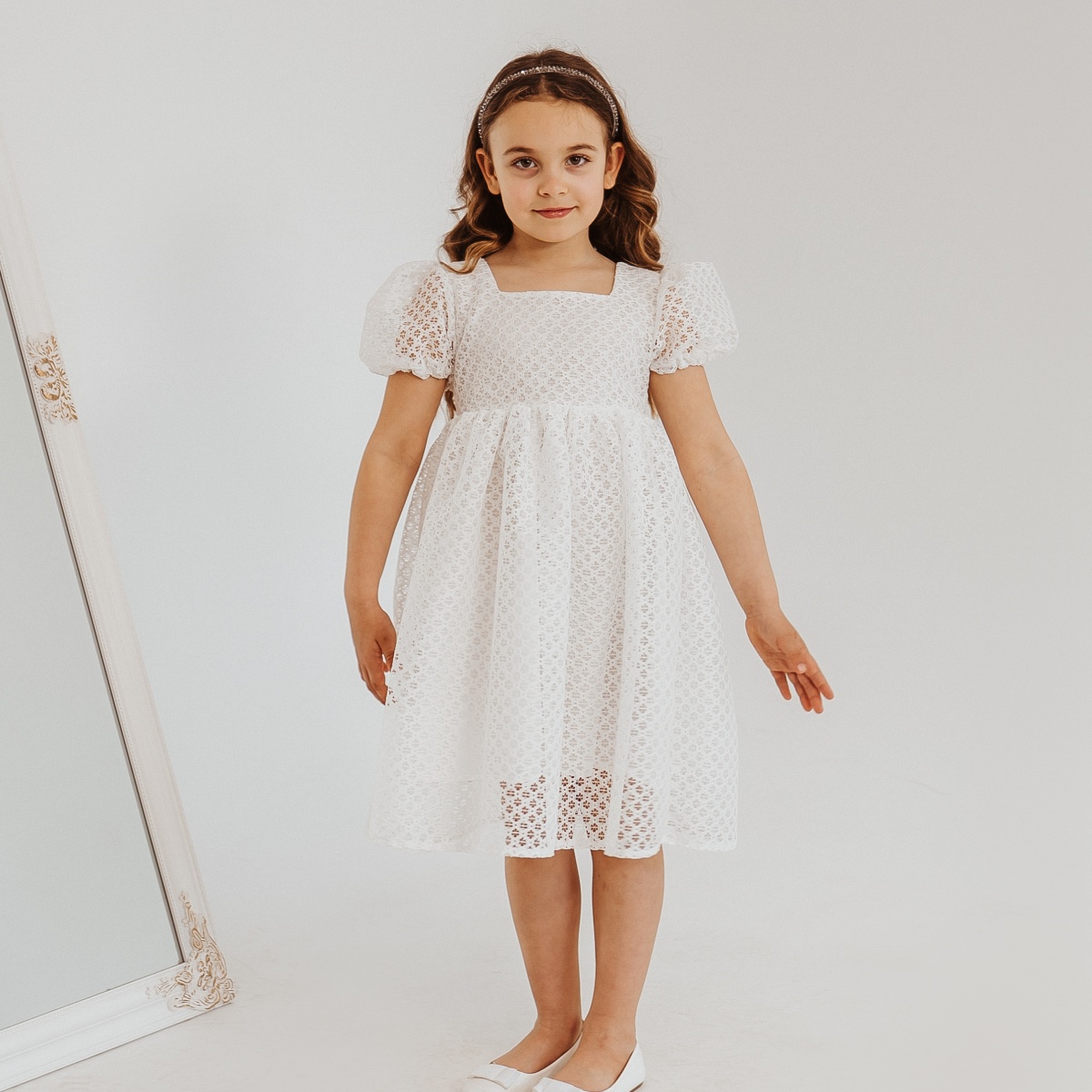 O rochie albă elegantă, cu mâneci scurte și o frumoasă fundă de satin la spate.