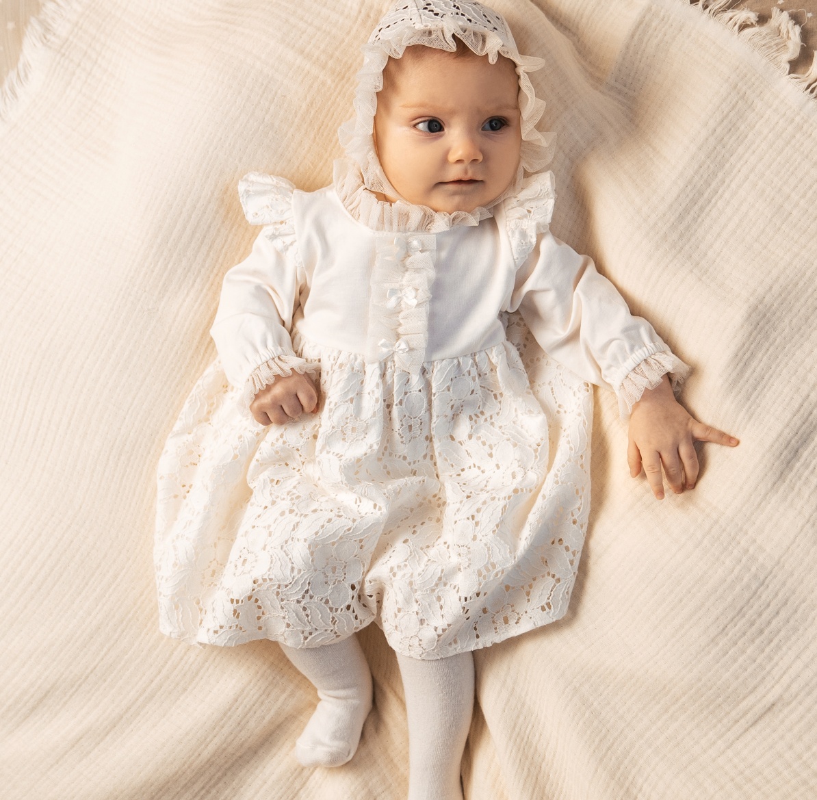 Această rochie din dantelă cu bonetă și bentiță este un set frumos și elegant. Perfect pentru un cadou.