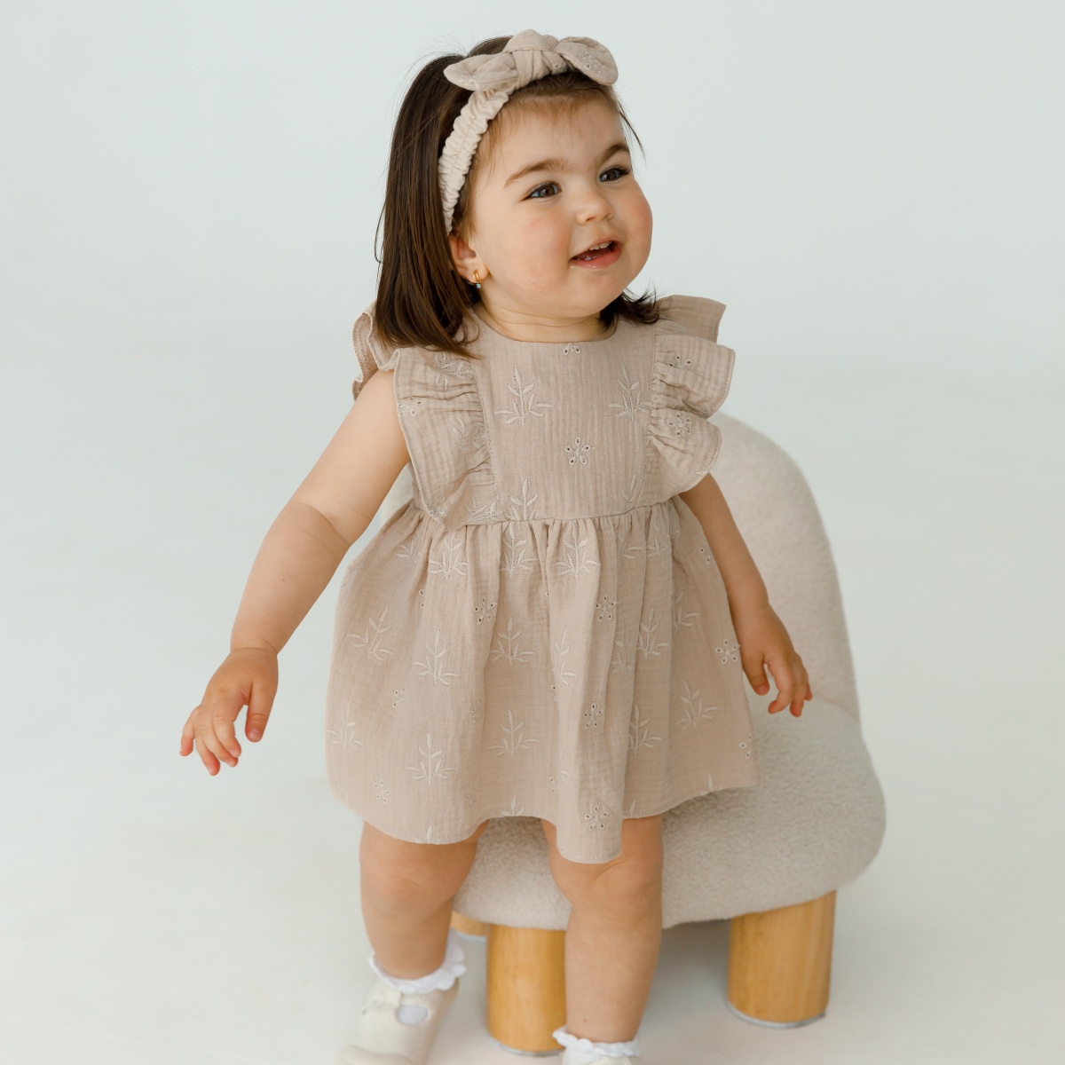 Costum de vară din muselină, format dintr-o rochie, o bentiță și chiloți incluși, care ascund perfect scutecul. Rochie de vară din muselină cu aripioare în loc de mâneci, închidere cu nasturi la spate.
