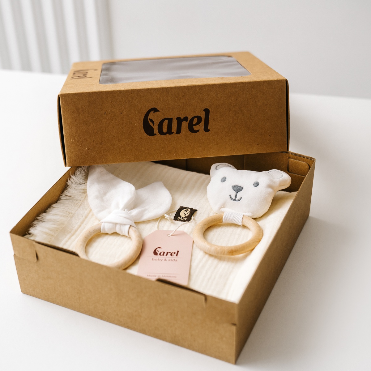 Acest set cadou vine într-o cutie frumoasă. Include două jucării și o pătură de muselină. Acest cadou îl va încânta pe micuțul tău și îi va impresiona pe părinți.